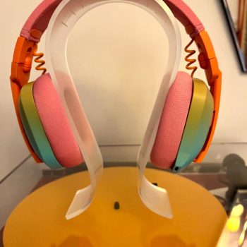 Unique feature of listening to two sources at once. Great microphone quality with built-in mute. The design adds personality.